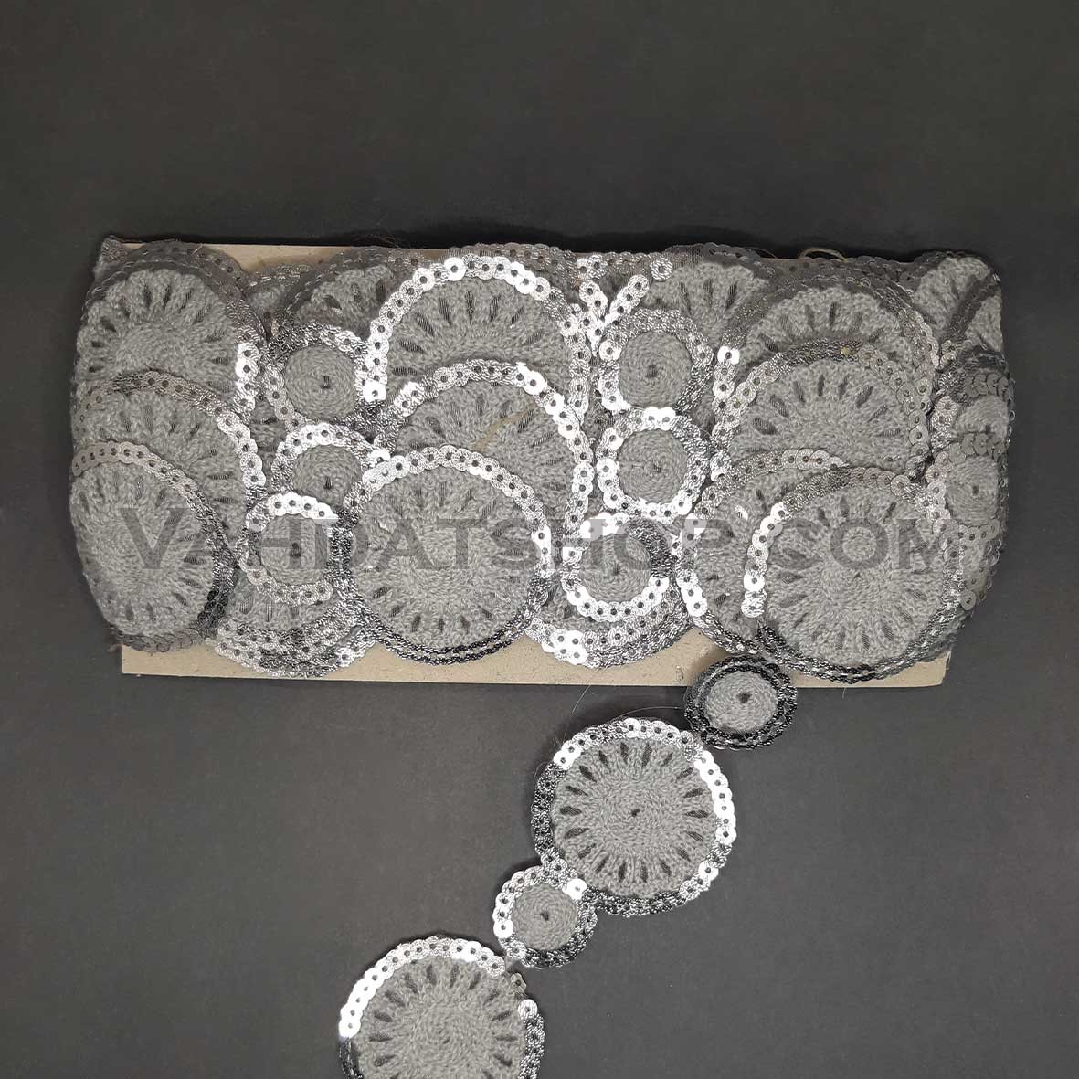 یراق پولک دوزی 1426 نقره ای از جمله محصولاتی است که برای تزئین لباس، مانتو، انواع رومیزی و... به کار می رود. این محصول در متراژ 7 یاردی و با طرح گل نقره ای رنگ تولید وعرضه می شود. این یراق را می توان با دوختن به لباس، مانتو و... متصل نمود. یراق پولک دوزی 1426 نقره ای جلوه زیبایی به کار شما می بخشد و آن را خاص می کند.